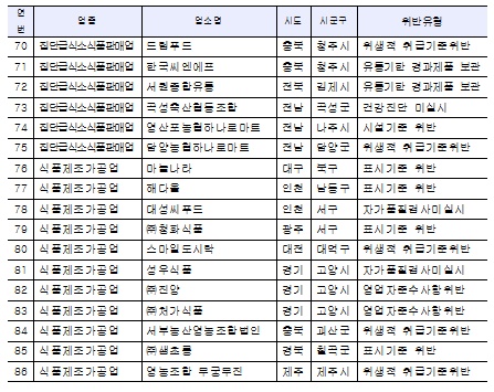 식약처는 앞으로 위반업체를 집중 점검할 예정이며, 위생진단 컨설팅 등도 병행해 유사 사례가 재발하지 않도록 최선을 다하겠다고 밝혔다.
