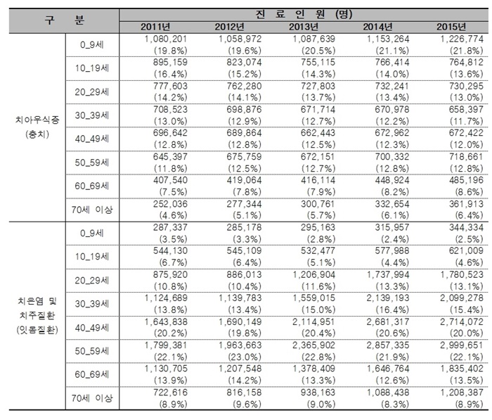 최근 5년간 충치 진료를 가장 많이 받은 연령대는 10세 미만으로 약 123만명(21.8%)이며, 잇몸질환의 경우 50대가 약 300만명(22.1%)으로 가장 많았다. 건강보험심사평가원은 충치 및 잇몸질환에 대해 2011~2015년 건강보험·의료급여 심사결정 자료를 분석한 결과를 발표했다.