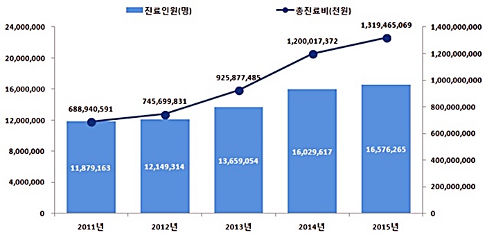 지난해 진료인원은 약 1658만명으로 2011년보다 약 470만명(39.5%) 증가해, 국민 3명 중 1명이 진료를 받았다. 총진료비는 약 1조3195억원으로 2011년에 비해 약 6305억원(91.5%) 늘었다.