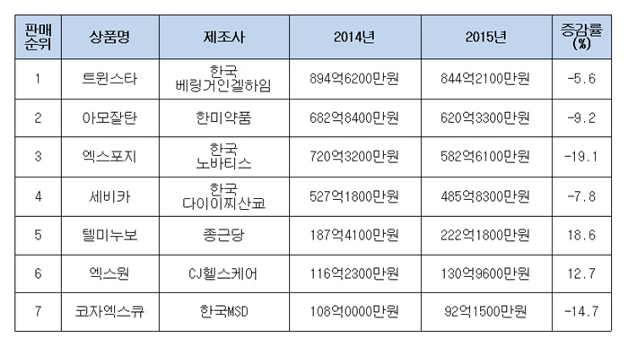 지난해 고혈압복합제 ARB+CCB 원외처방액 상위 7품목(출처: 유비스트)