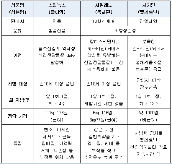 주요 불면증치료제 졸피뎀 vs ‘사일레노’ vs ‘서카딘’ 3종 비교표