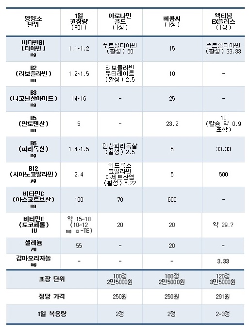 비타민B군 복합제 ‘아로나민 골드’ vs ‘삐콤씨’ vs ‘액티넘 EX플러스’ 성분 및 가격 비교표