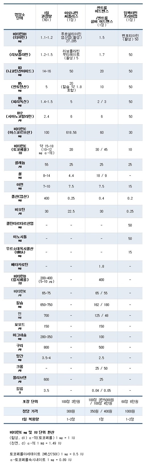 종합비타민제 ‘아로나민 씨플러스’ vs ‘센트룸 어드밴스’ vs ‘임팩타민 프리미엄’ 성분 및 가격 비교표