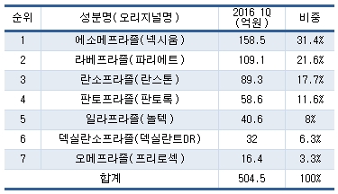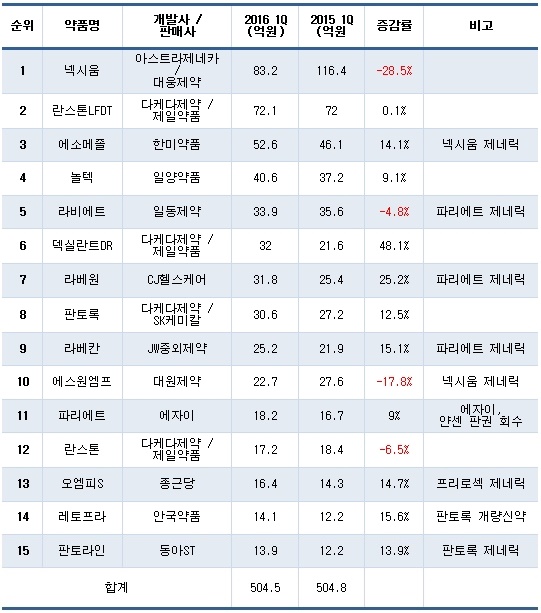 PPI제제의 2016년 1분기 원외처방액 상위 15품목 매출액(매출 단위 억원, 자료 유비스트)
