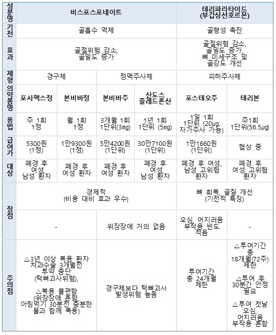 1차 치료제, 비스포스포네이트 제제 … 3년 이상 복용자, 치과수술시 턱뼈괴사 주의
