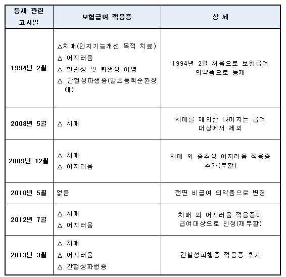 2010년 5월에는 치료보조제 성격이 강하다는 이유로 급여 대상 의약품에서 삭제됐지만 2012년 7월 급여 목록에 다시 등재돼 인지기능장애를 동반한 치매, 중추성 어지러움에 한해 건강보험이 적용됐다. 2013년 3월부터 간헐성파행증까지 급여 지원범위가 확대됐다.