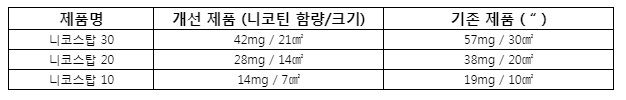 삼양바이오팜의 패치형 금연보조제 ‘니코스탑패취’의 니코틴 함량 및 크기 변경 비교표