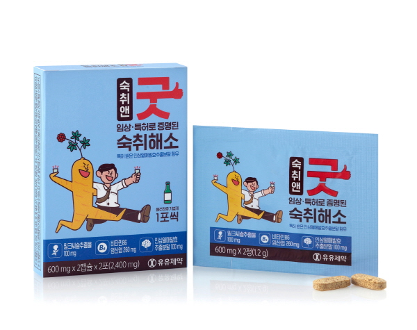 유유제약은 숙취해소제 ‘숙취앤굿’을 출시, 2000억 규모로 추정되는 숙취해소제 시장에 뛰어든다고 2일 밝혔다. 숙취앤굿은 인삼열매 발효추출물을 주성분으로 밀크씨슬, 헛개나무, 강황 등 숙취 개선 및 간 보호에 도움을 주는 다양한 성분을 포함한다.