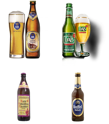 독일 맥주 4대 분파인 뮌헨(윗줄 왼쪽부터 시계방향으로), 도르트문트, 쾰른, 매르젠 스타일을 대표하는 맥주들. ‘호프브로이’, ‘DAB 맥주’, ‘가펠 쾰쉬’, ‘슈렝케를라 매르젠’