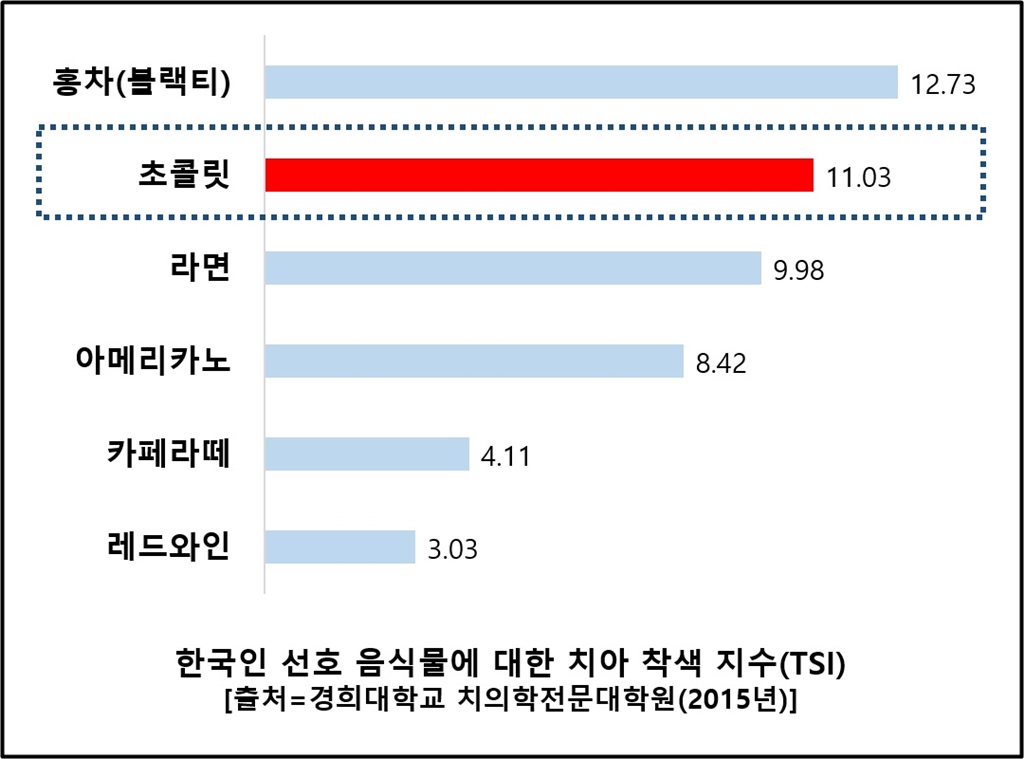 경희대 치의학전문대학원 연구에 따르면 한국인 선호 음식물 중 초콜릿의 치아 착색지수는 11.03으로 홍차 12.73 다음으로 높았다. 흔히 치아 착색 원인으로 꼽히는 커피(8.43), 와인(3.03)보다 높다.