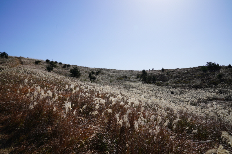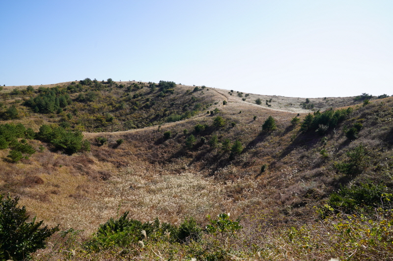 바쁜 걸음으로 올라 능선에 서서 보니 분화구 셋이 이마를 마주대고 있고 그 가장자리를 넓게 봉우리와 능선이 둘러싸고 있다. 분화구 안에서 나온 세 갈래의 길이 바깥 능선의 높은 봉우리에 걸려 있다. 분화구와 능선엔 온통 억새가 햇빛에 반짝이고 있었다.