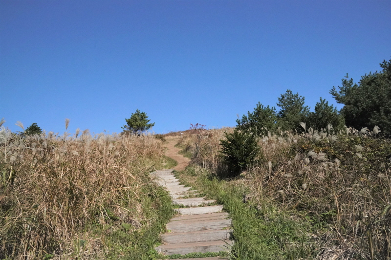 따라비오름의 정상 능선이 눈앞인데 가을 하늘은 더욱 파랗고 오름은 숲의 초록을 벗어버리기 시작한다.