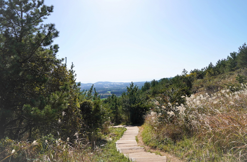 따라비오름 나무계단을 오르다 돌아서서 바라보는 남쪽 바다가 한없이 편안하다.